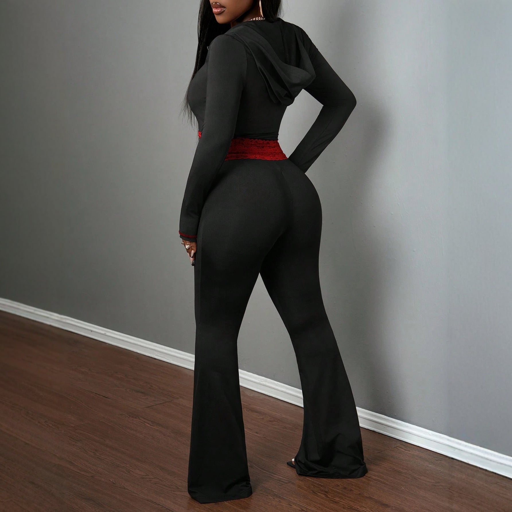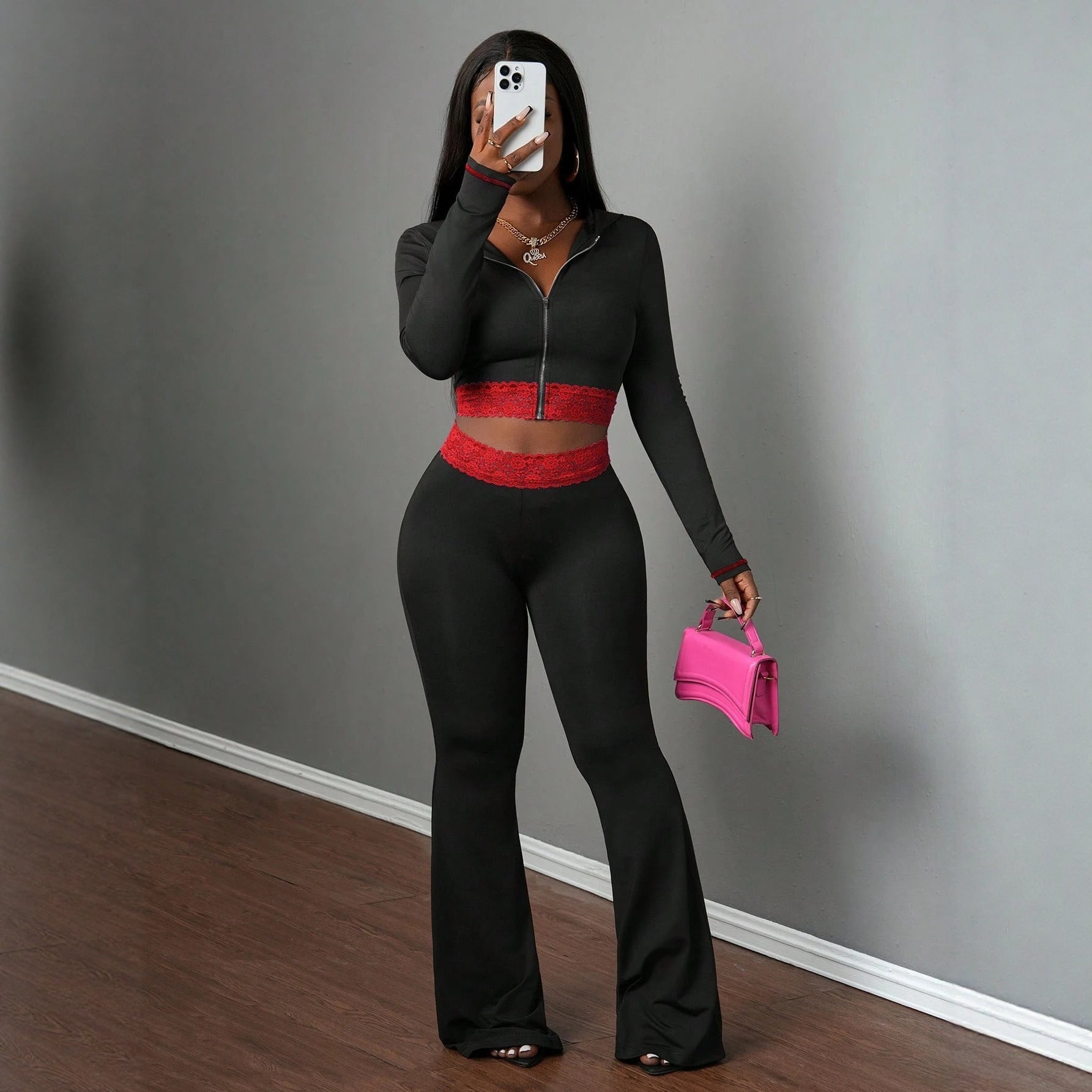 Fashionable Solid-Color Patchwork Lace Casual Jacket And Pants Set