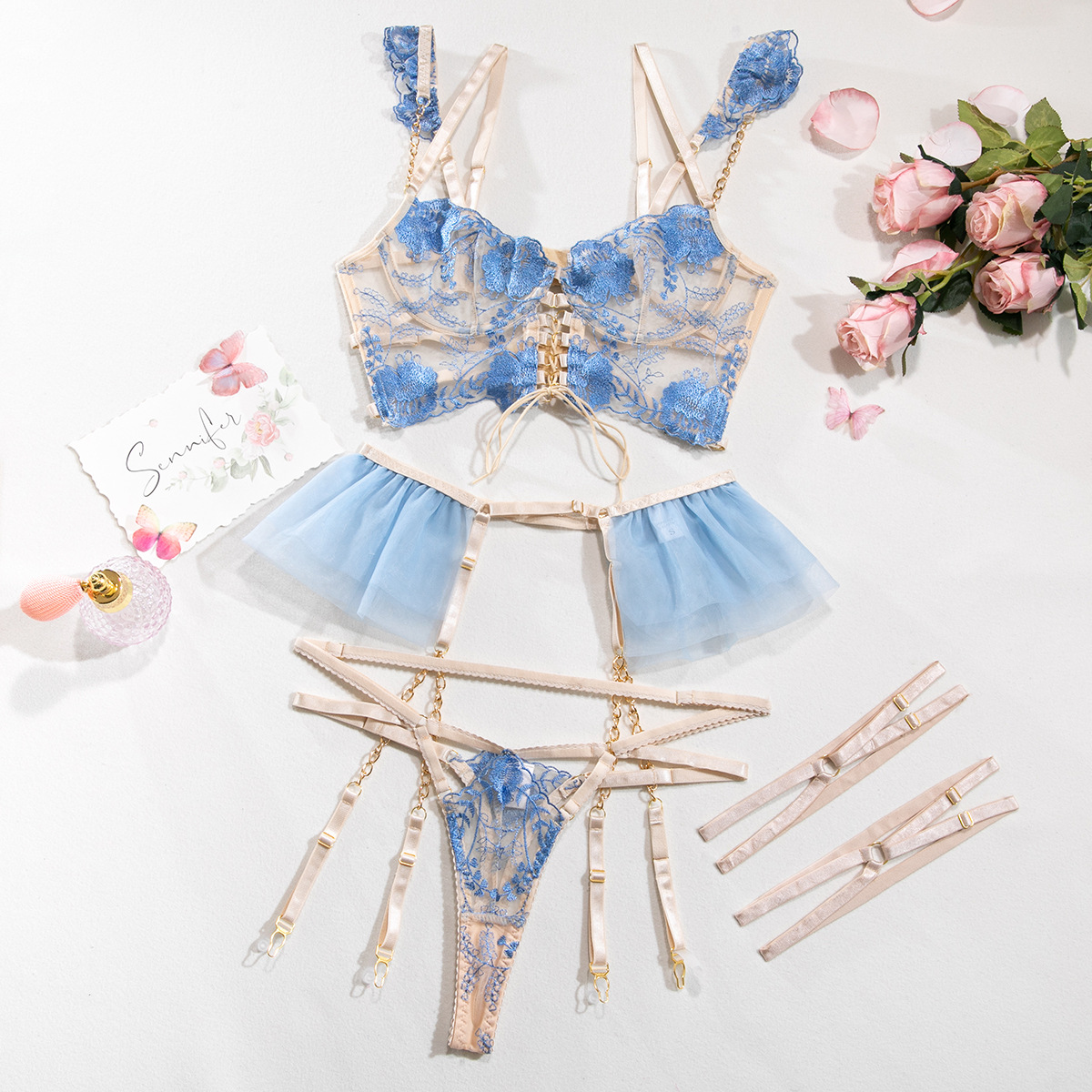 Women's Fashion Simple Embroidered Flower Gathered Four-piece Set